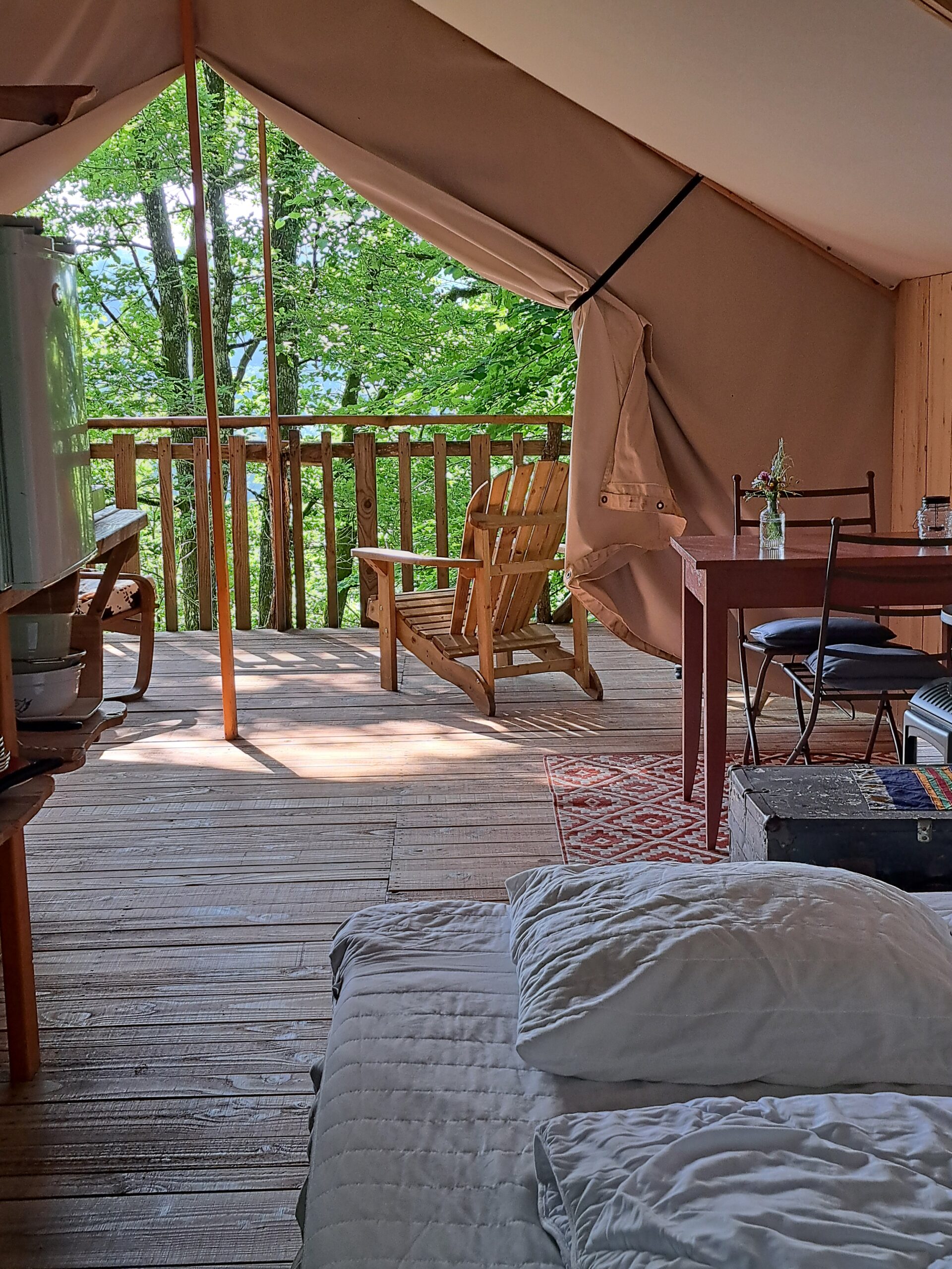 Avec coin cuisine, salle d’eau, toilettes, et joliment meublées, elles offrent à la fois un confort douillet et un contact direct avec la nature. Le grand espace privé autour de la tente lui garde toute son intimité et les soirées se prolongent délicieusement à la lueur des bougies. Coin cuisine avec plaques de cuisson, petit frigo et machine à café à filtre.